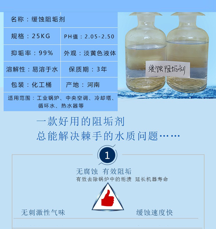 使用方法將每天所需的 JK-0602 緩蝕阻垢劑加入加藥罐中,加水沖稀,根據(jù)稀釋后藥劑容量計算出 24 小時加藥速率,調(diào)整計量加藥泵流量,用計量泵均勻的加入水系統(tǒng),確保 24 小時將當日的藥劑加完。投加量按照補給水計算,噸水投加量50-100ppm。
