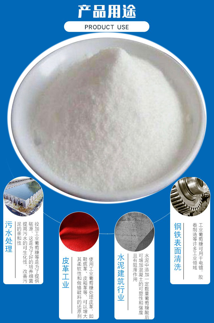 3、工業(yè)葡萄糖用做鋼鐵表面清洗劑:鋼鐵表面如需要鍍缽、鍍鉻、鍍錫、鍍鎳以適應(yīng)特殊用途時,如制造馬口鐵,鍍鋅板,表面鍍鉻(電度)等,其鋼坯表面均需經(jīng)過嚴格清洗,使鍍層物與鋼鐵表面牢固結(jié)合,這時候其清洗藥劑中添加葡萄糖酸鈉將會達到十分理想的效果。工業(yè)葡萄糖可用于電鍍,膠卷制造等許多工業(yè)領(lǐng)域。