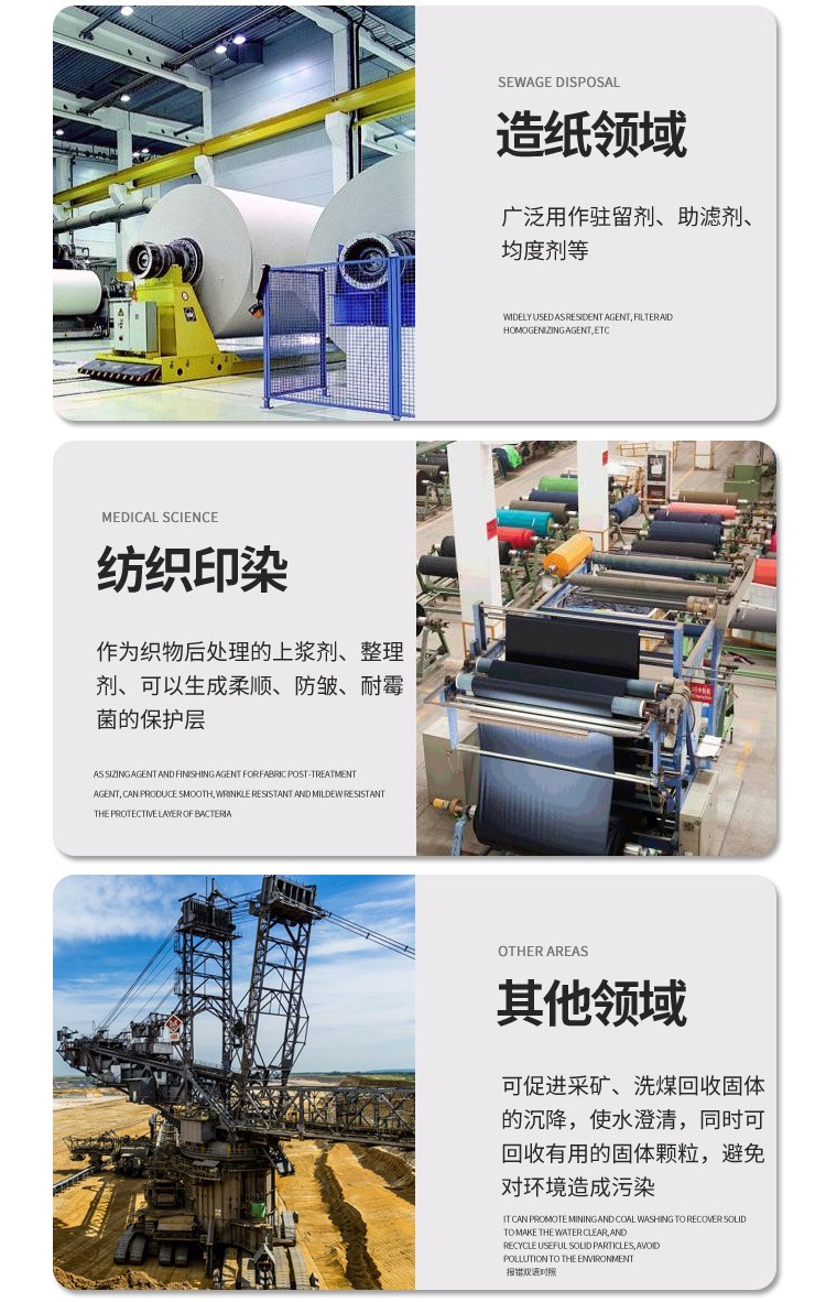 陰離子聚丙烯酰胺:是水溶性的高分子聚合物, 主要用于各種工業(yè)廢水的絮凝沉降,沉淀澄清處理,如鋼鐵廠廢水,電鍍廠廢水,冶金廢水,洗煤廢水等污水處理、污泥脫水等。還可用于飲用水澄清和凈化處理。由于其分子鏈中含有一定數(shù)量的極性基團,它能通過吸附水中懸浮的固體粒子,使粒子間架橋或通過電荷中和使粒子凝聚形成大的絮凝物,故可加速懸浮液中粒子的沉降,有非常明顯的加快溶液澄清,促進過濾等效果。